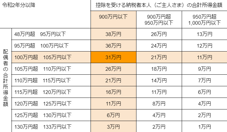 下記の表のとおり、配偶者特別控除の金額は31万円となります。