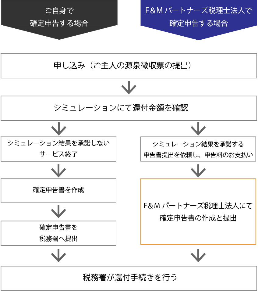 無料で「還付金受取額確認シミュレーション」をしたあと、F&Mパートナーズ税理士法人に確定申告手続きを依頼することが可能です。
