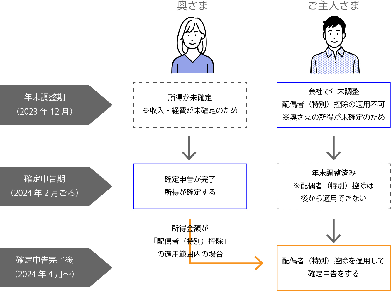 確定申告の結果、お客さま(奥さま)の所得が一定額以下の場合、ご主人が配偶者(特別)控除の適用を受けることができます。そのため、ご主人が年末調整や確定申告で配偶者控除を適用していない場合は、確定申告によって還付を受けられる可能性があります。